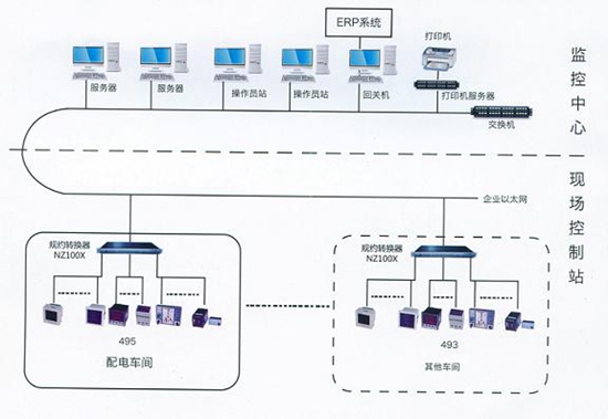根據(jù)車間設(shè)備較多,分布比較分散的特點(diǎn),配電車間電量采集選用NZ194E完成一回線全電量采集,如電流、電壓等。其他監(jiān)控模塊選用NZ194I/O,采集直流模擬量如車速、溫度、流量等數(shù)據(jù),實(shí)現(xiàn)對車間生產(chǎn)設(shè)備的全面監(jiān)測。同時(shí)通過RS485總線把數(shù)據(jù)集中到串口服務(wù)器NZ100X上,集中后經(jīng)以太網(wǎng)把數(shù)據(jù)送往監(jiān)控中心,由NZ800P配電電動(dòng)化系統(tǒng)軟件處理。